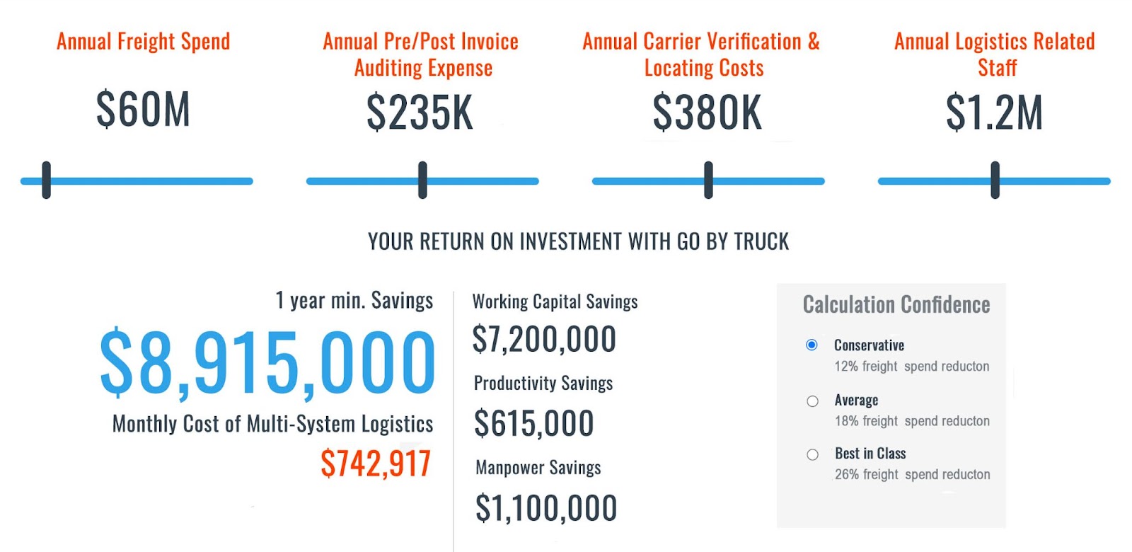 Use the impact calculator to estimate your ROI with the Go By Truck logistics technology. We are confident Go By Truck will provide huge value for your team and business.